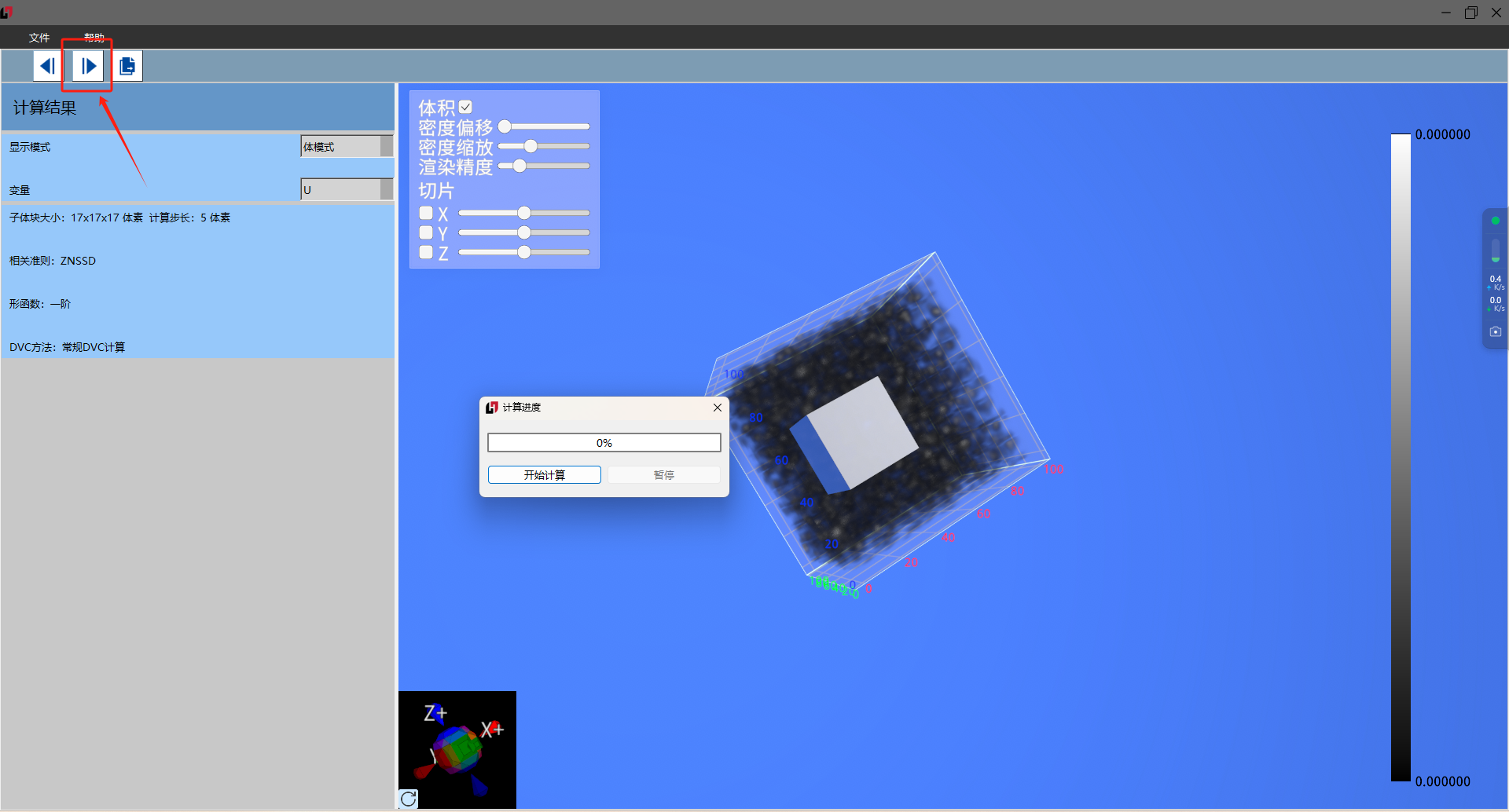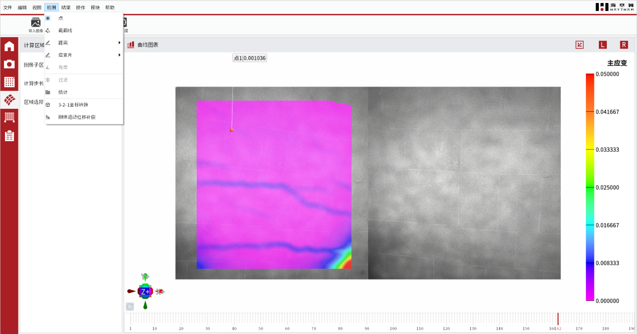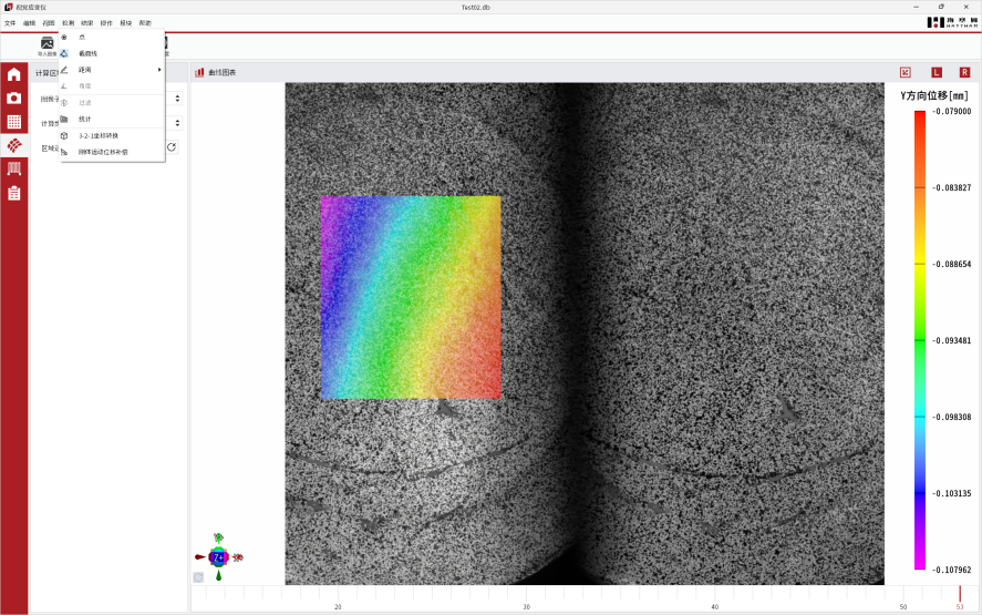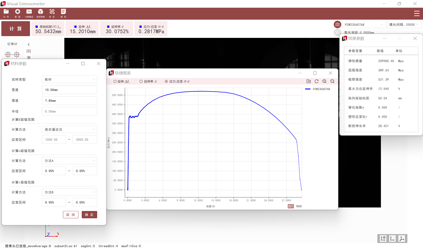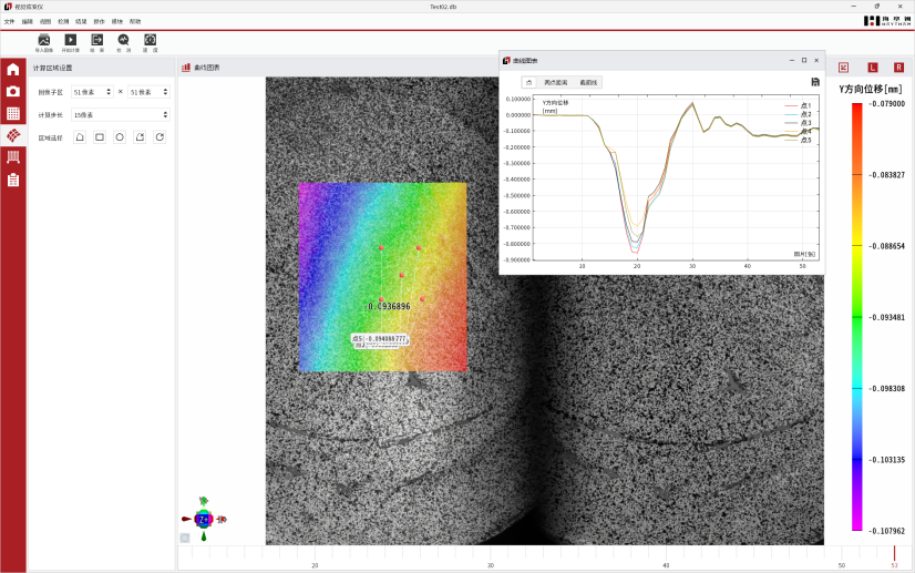 调节视频引伸计设备的物距角度,使其系统位于合理位置上并进行标定作业。对待测试件表面进行特征点布置(标准标记点/手绘标记点)。